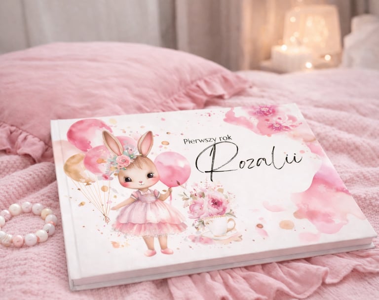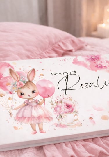 Subtelny, personalizowany album „Pierwszy rok” dla dziewczynki, stworzony, by zamknąć w jednym miejscu wszystkie wyjątkowe chwile jej pierwszego roku.